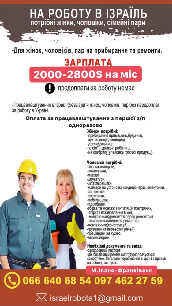 ✔️Передоплати в Україні за працевлаштування немає-оплата відбувається в Ізраїлі з першої зарплати в кінці місяця. Працюємо з клієнтами по всій Україні.
