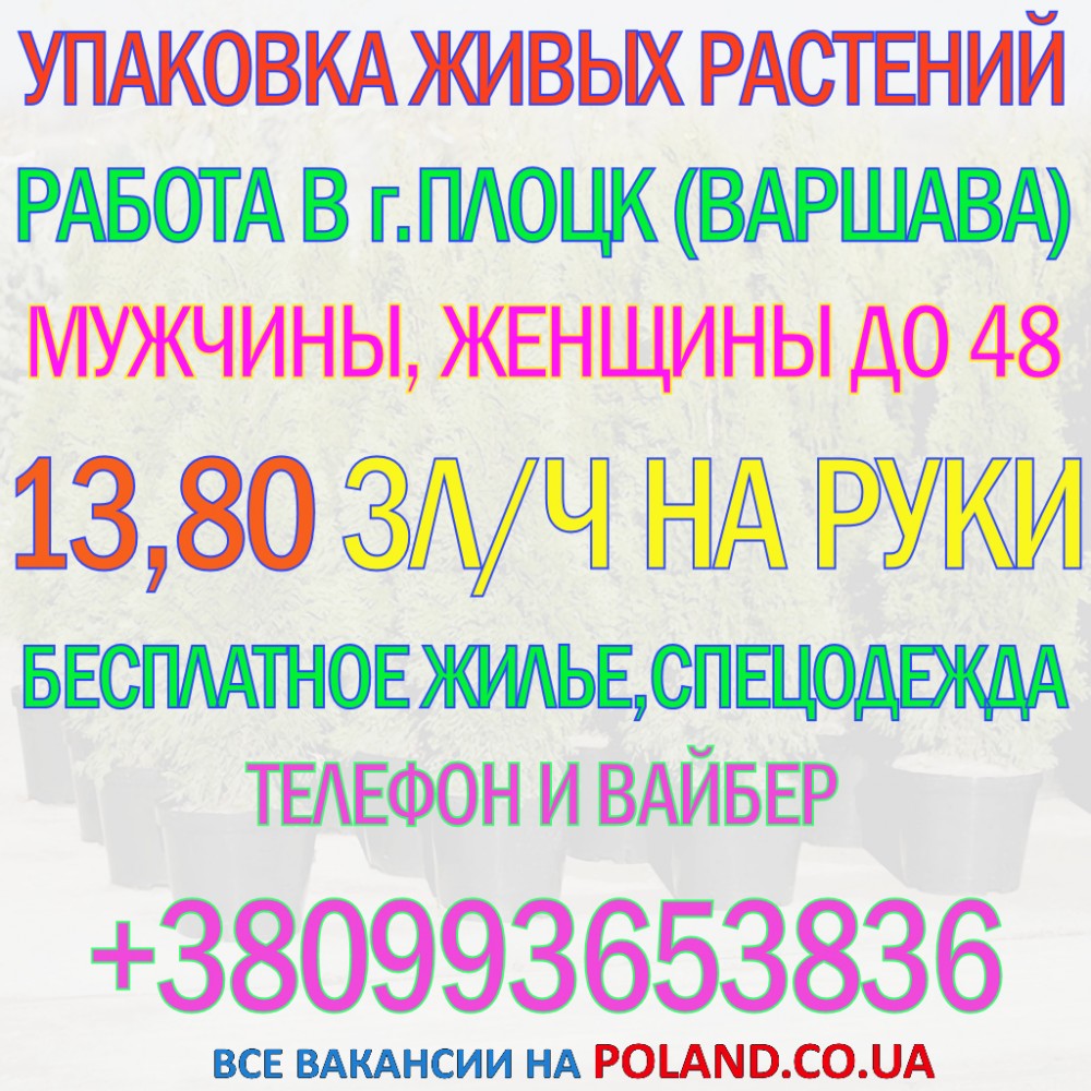 Требуются работники в зелёное хозяйство в г. Gąbin, в предместье г. Плоцк, район Варшавы. Простой неквалифицированный труд – упаковка саженцев растений.