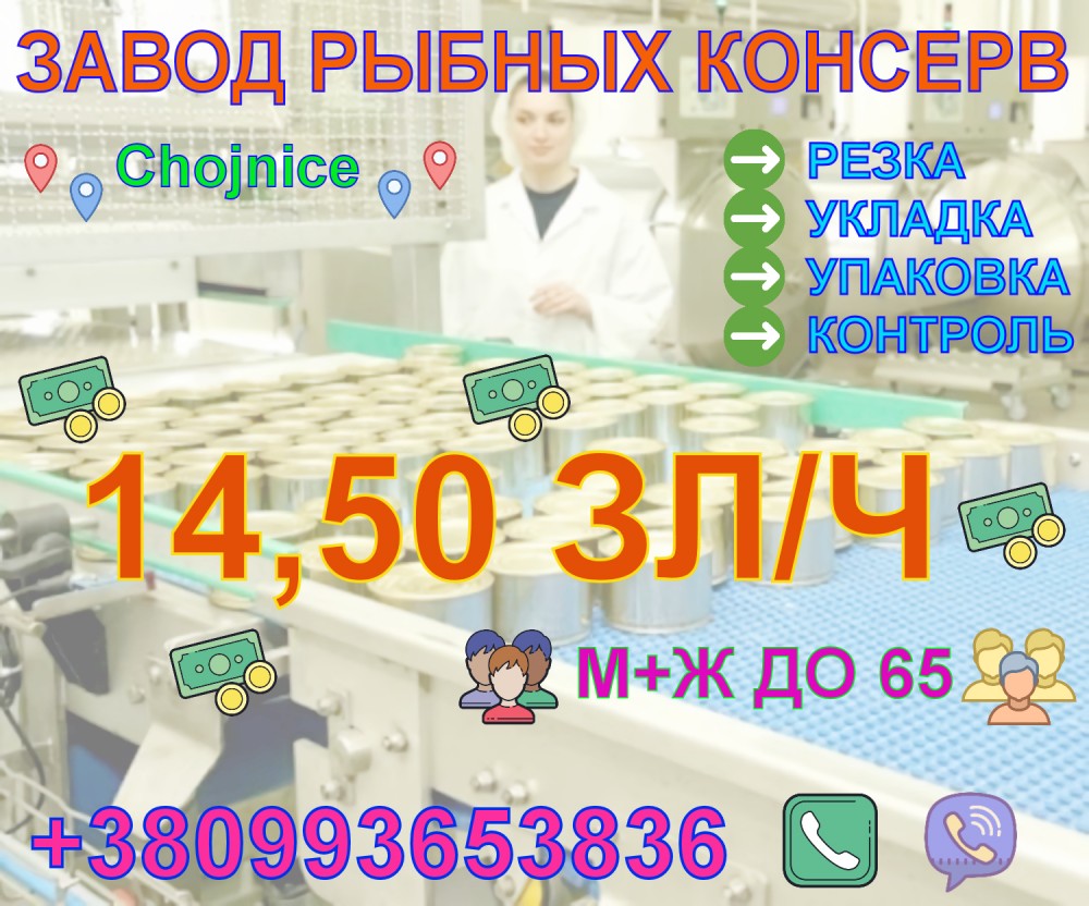 Требуются сотрудники на рыбный завод в г. Chojnice, в районе г. Быдгощ. Работа на крупном рыбном производстве, которое поставляет больше 200 элементов своего ассортимента – маринады, мороженая рыба, консервы, салаты, пасты сделанные в основном из селёдки и скумбрии.