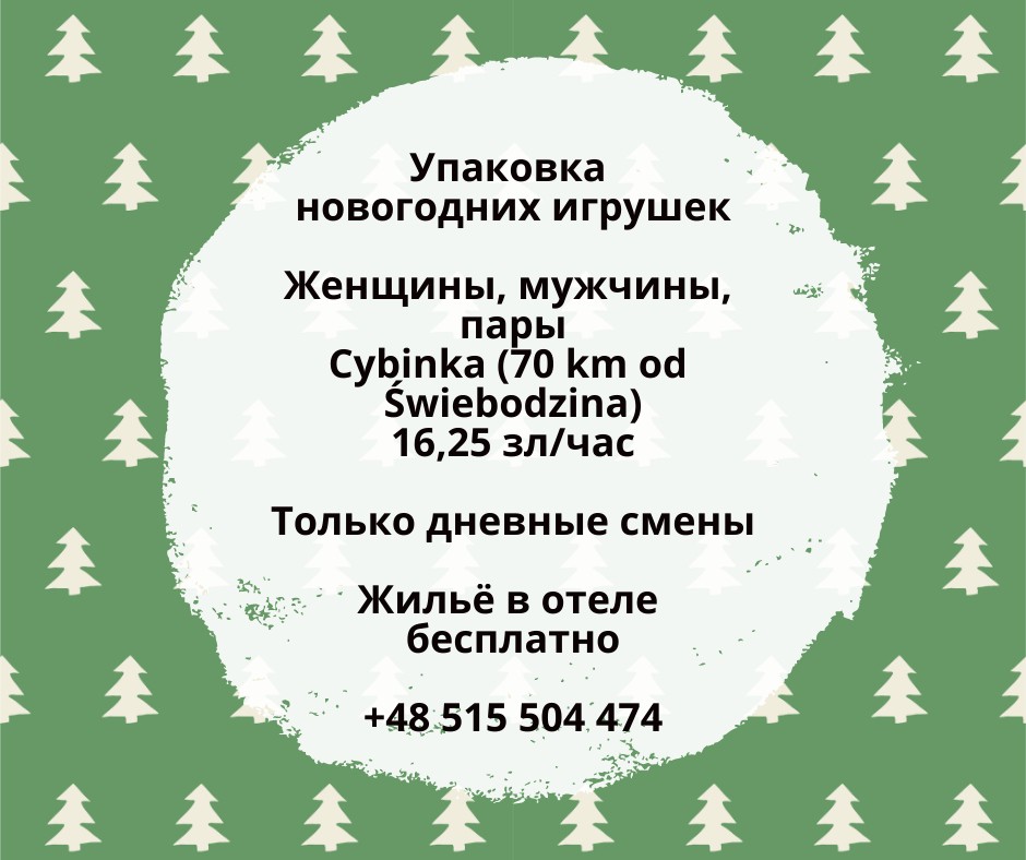 Описание работы: компания производит новогодние украшения. В обязанности входит упаковка украшений, сортировка, контроль качества.