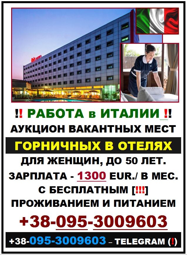 Срочно – набор женщин для работы горничными – рабочими прачечной, в отелях, в Италии. (По польским рабочим визам – актуальным на срок от 4-х месяцев). Возможен набор кандидатов по «БезВизу» (!!)) –