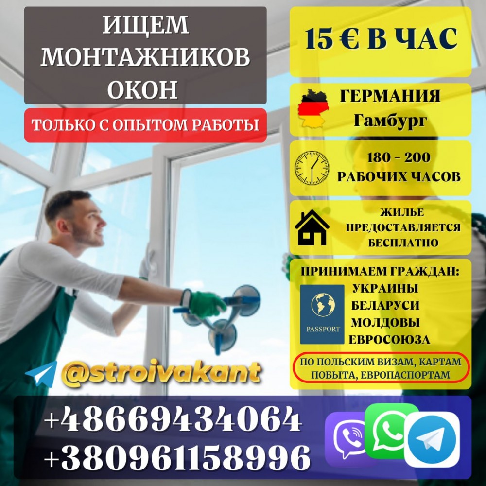 Монтаж окон. 15 евро в час. Жилье бесплатное