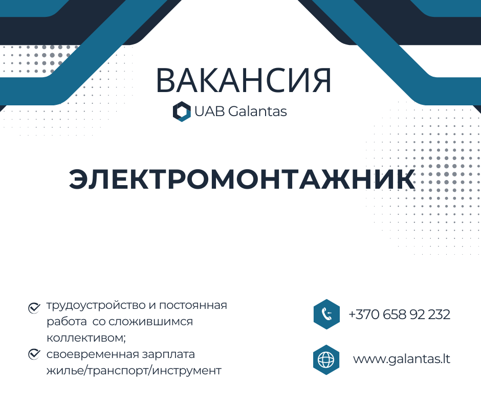 Приглашаем электромонтажников на постоянную работу в UAB Galantas (юр. адрес: Eišiškių pl. 36, Vilnius)