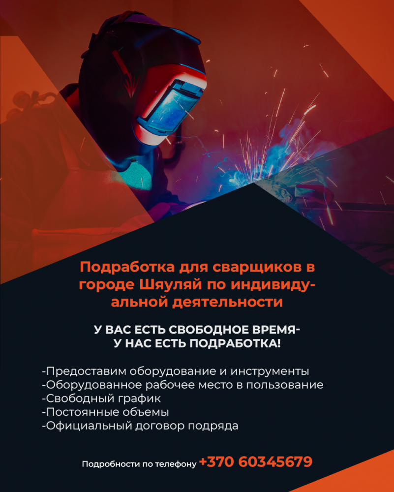 Работа для сварщиков в городе Щяуляй. Компания дает проекты, это могут быть перила, заборы, балконные ограждения, изделия из нержавейки, ангары и т.д. Закладывается бюджет в проект, финансы распределяются между исполнителями. Предоставим оборудование, инструменты, расходный материал и прочее.