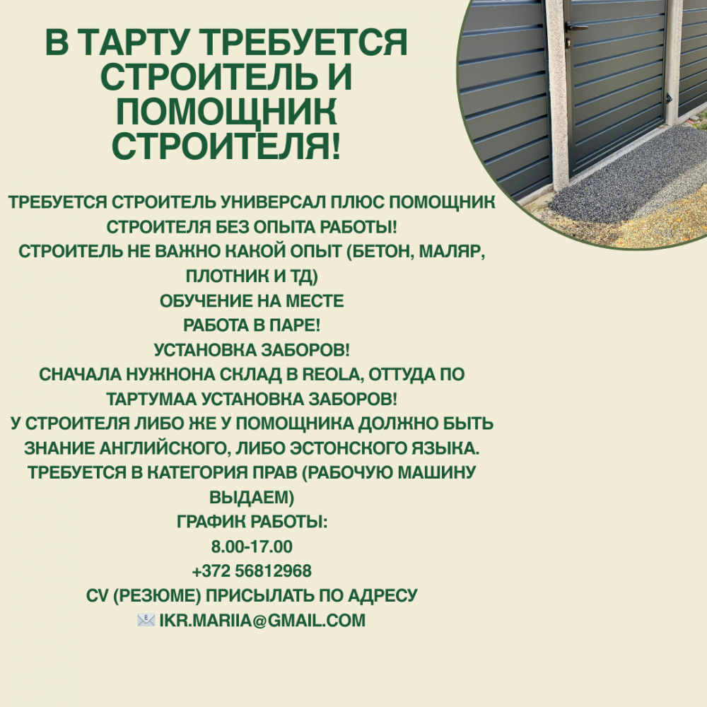 Требуется строитель универсал плюс помощник строителя без опыта работы!
