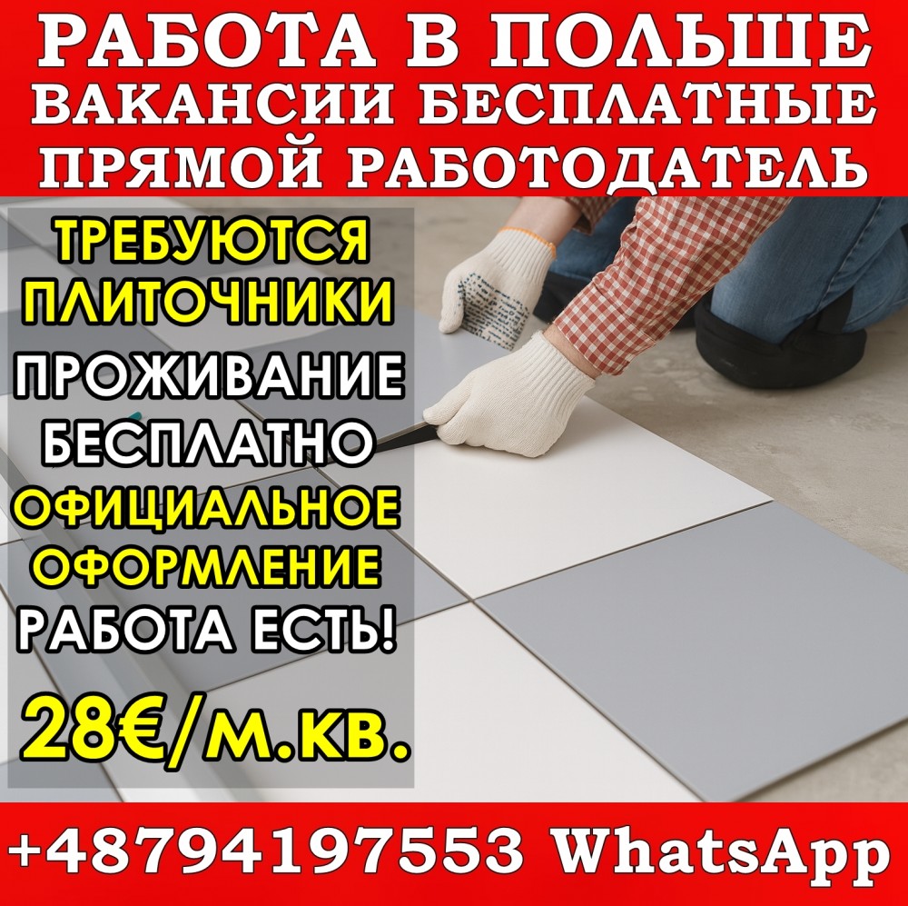 Требуются плиточник. Оплата высокая. Жильё бесплатно. Официально