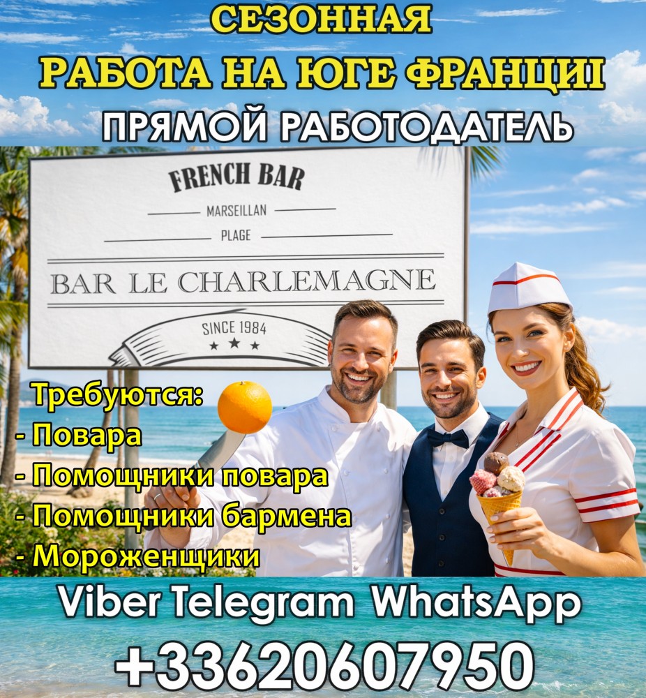 Повара, помощники повара, помощники бармена, мороженщики. Юг Франци. Средиземное Море
