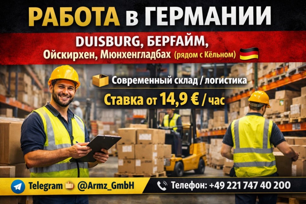 🔥 Работа в Германии — DUISBURG,БЕРГАЙМ, Ойскирхен, Мюнхенгладбах (рядом с Кёльном) 🇩🇪